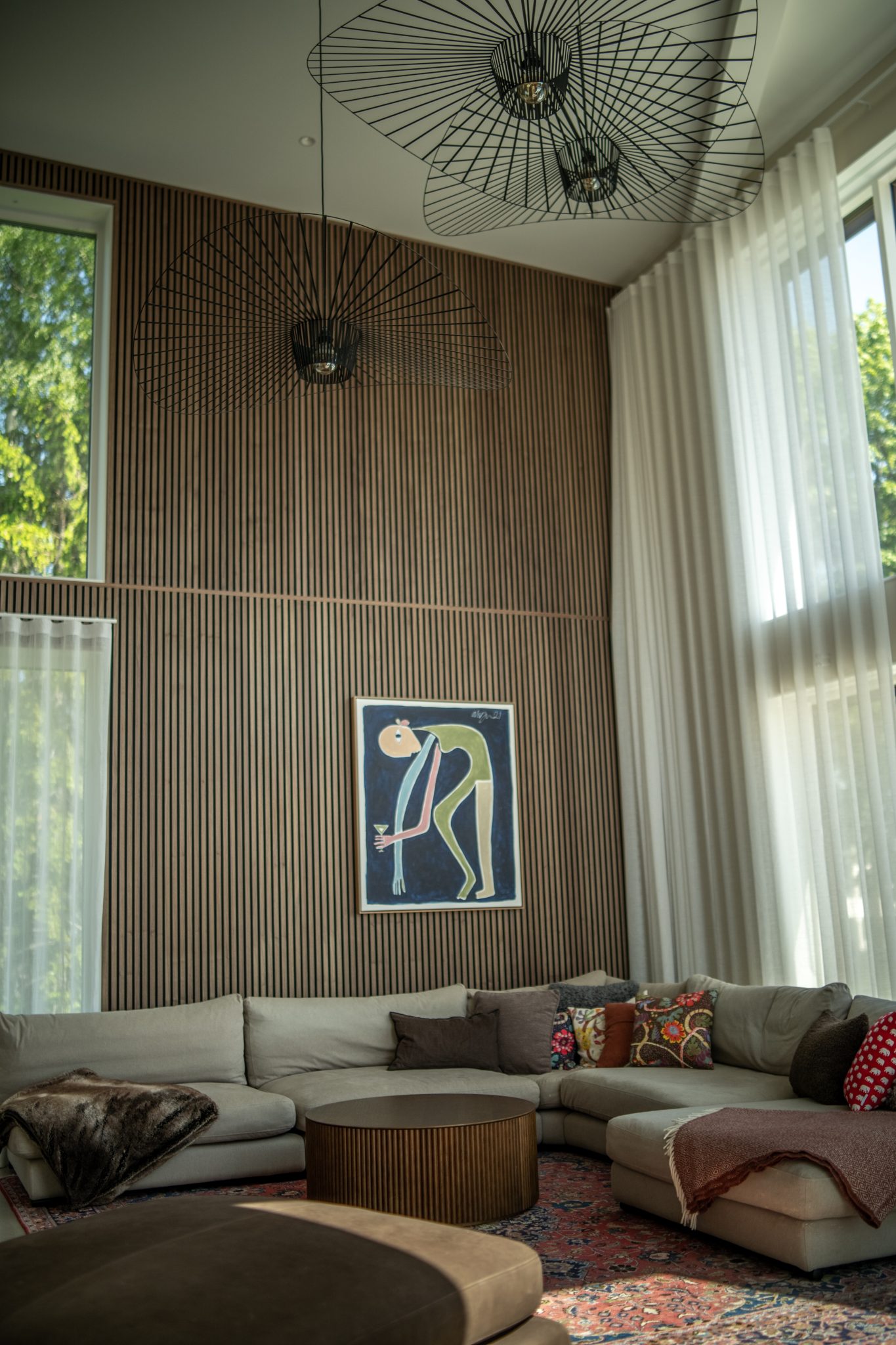 Uma sala com pé direito alto e paredes brancas pode parecer estéril. A solução? Akupanels do chão ao teto.