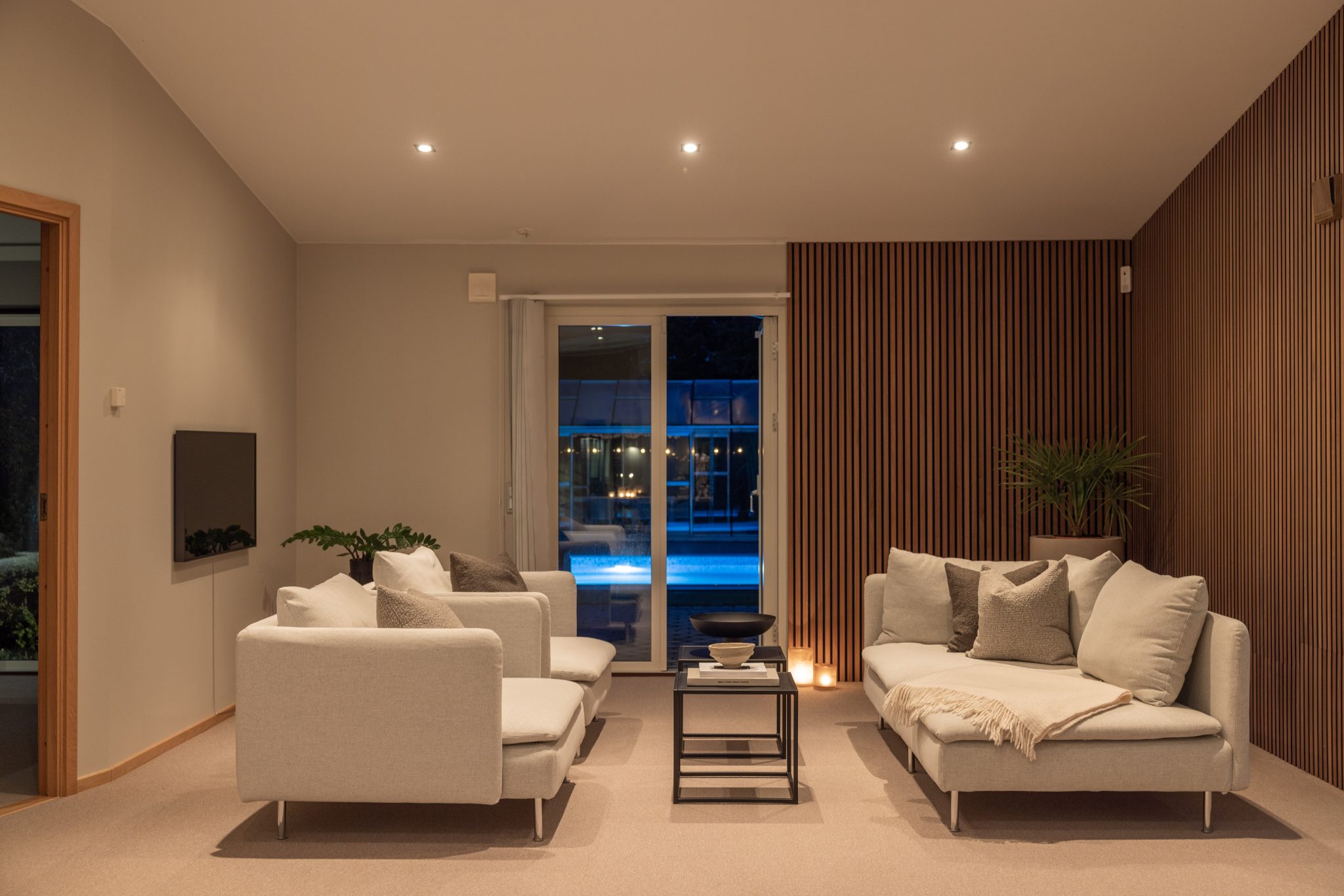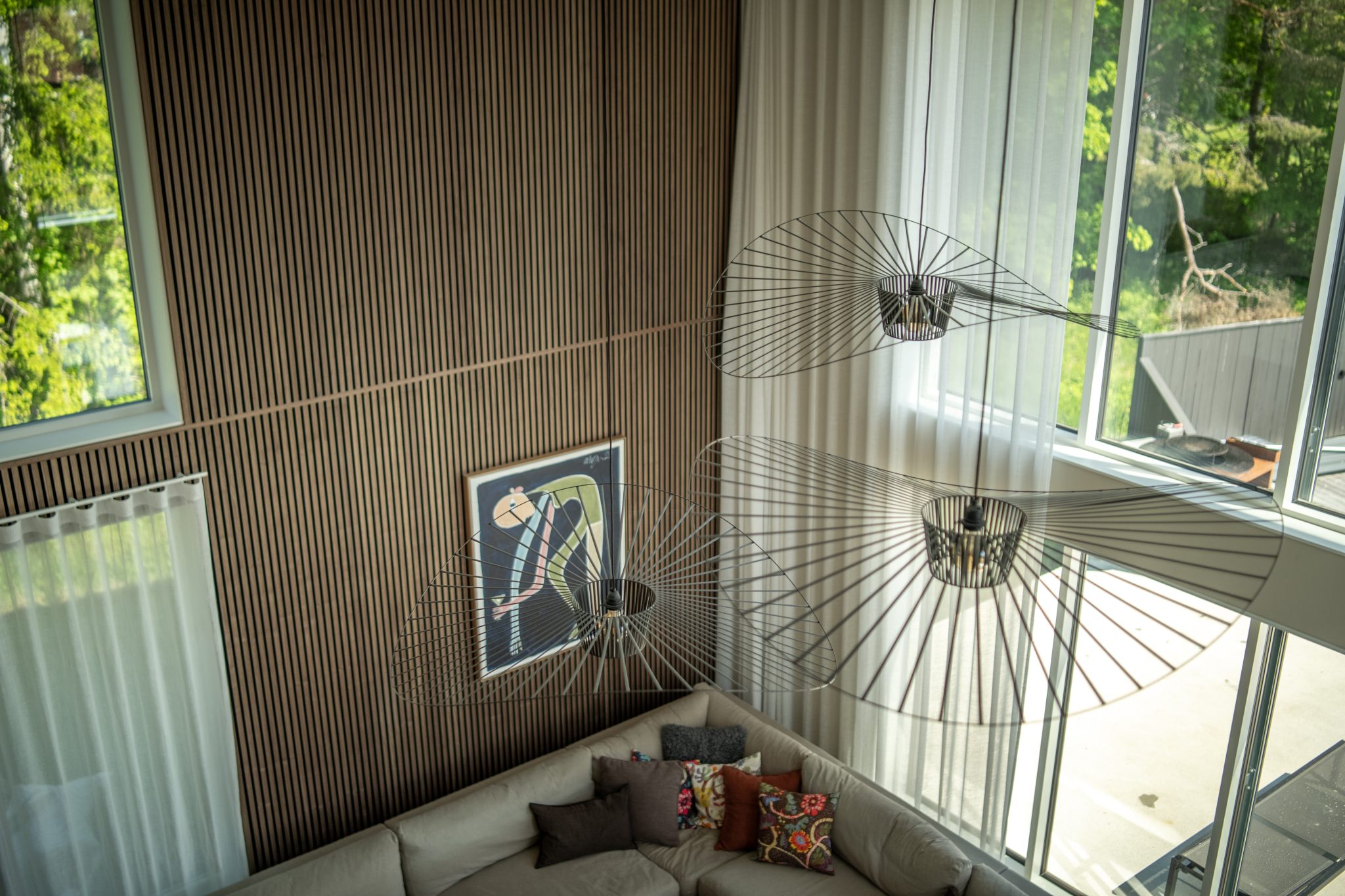 As linhas verticais acentuam a altura e, quando colocados num canto, os painéis criam uma zona mais acolhedora — ideal para estar com amigos ou família.
