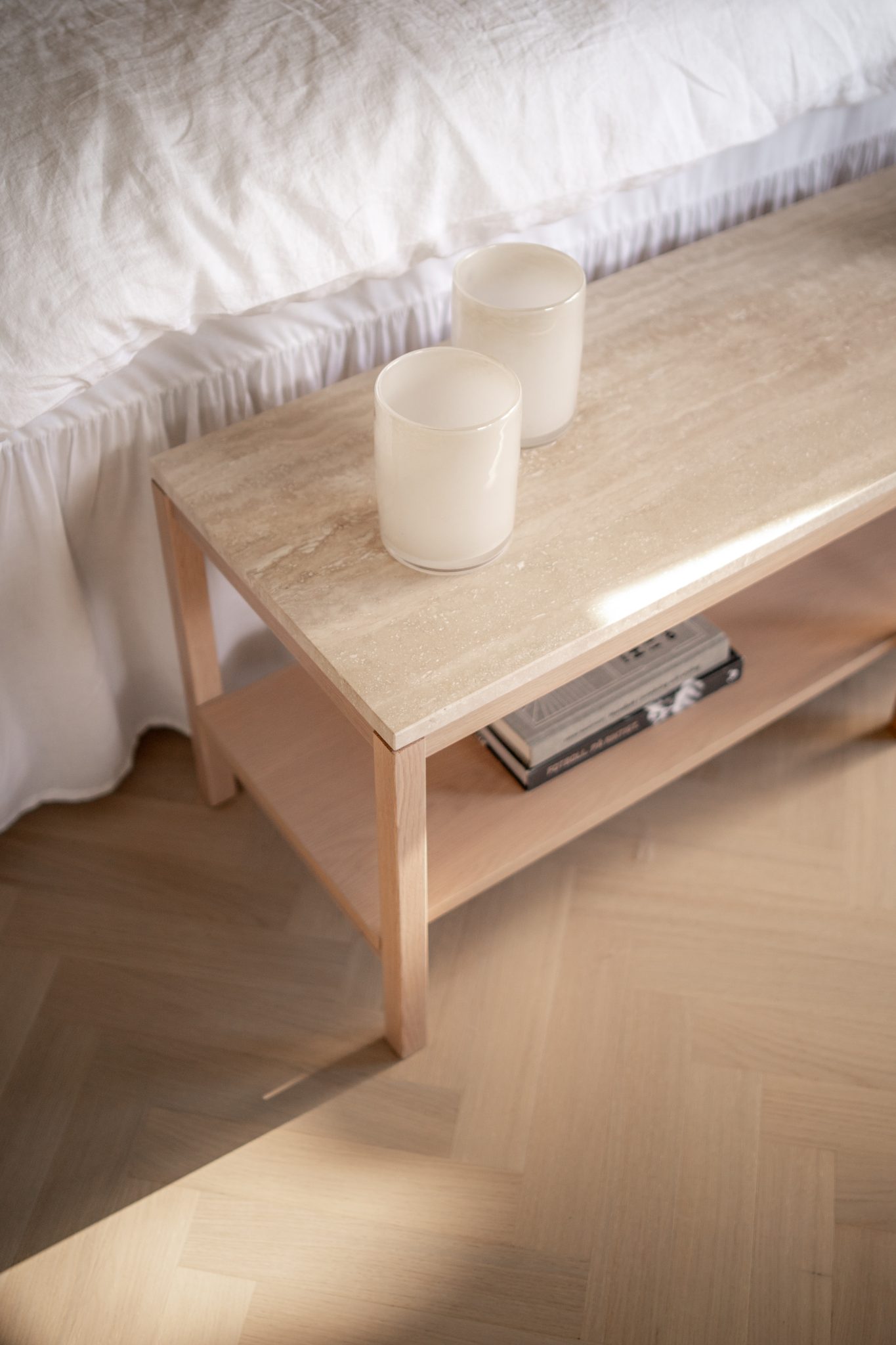 A mesa de cabeceira aberta dá leveza e o banco ao fundo da cama cria equilíbrio.