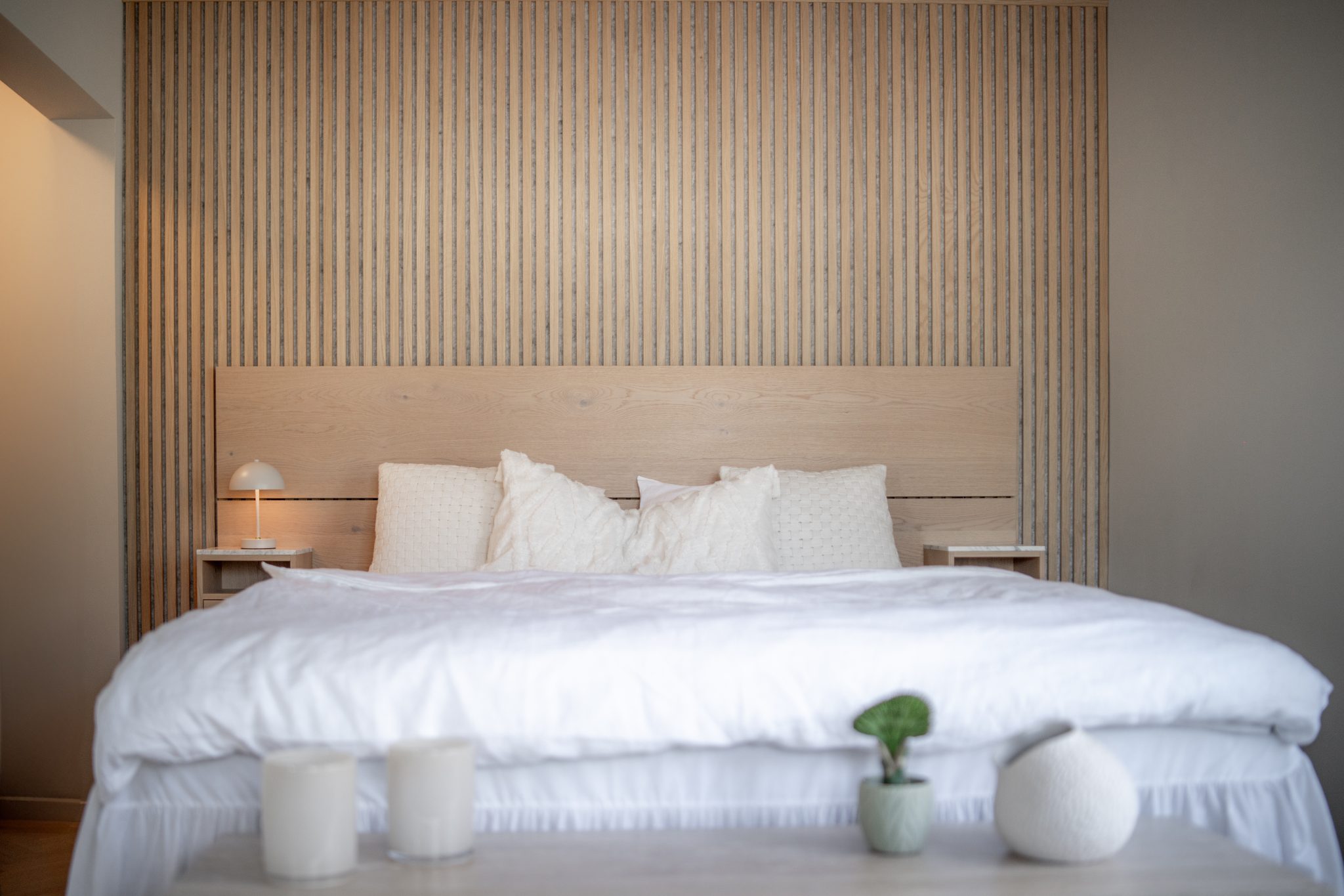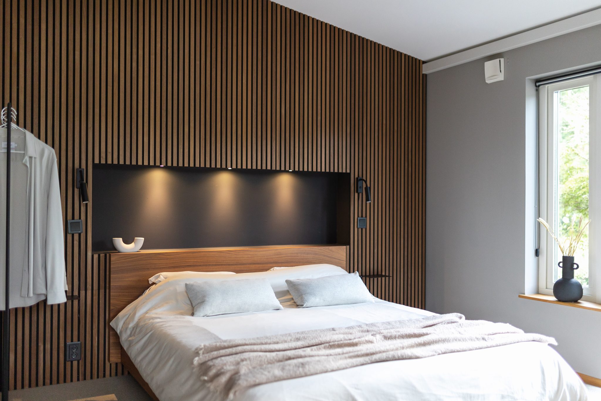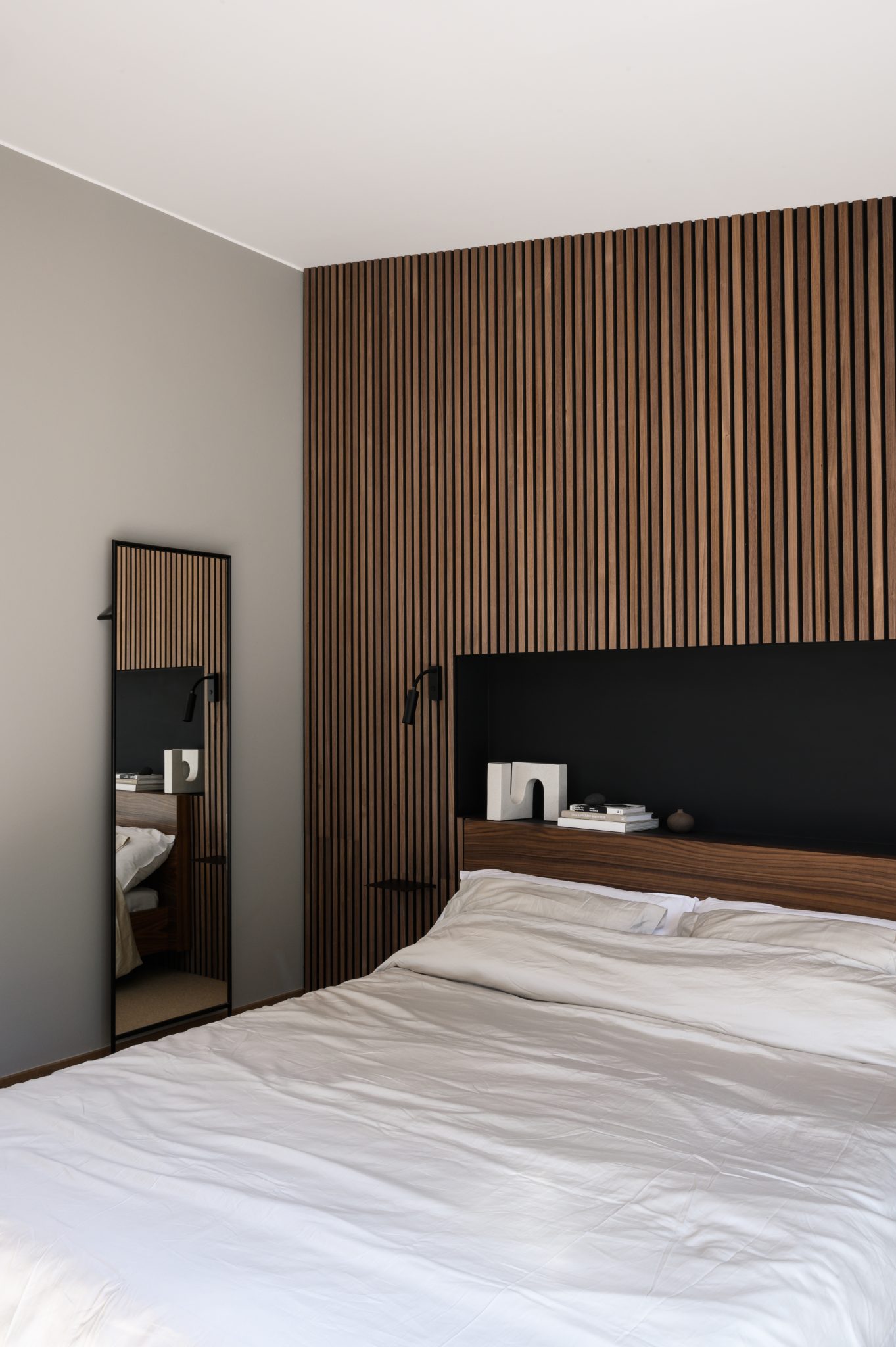 O painel em carvalho clássico com feltro cinzento cria um fundo para a cama — como se ela tivesse algo onde se apoiar.