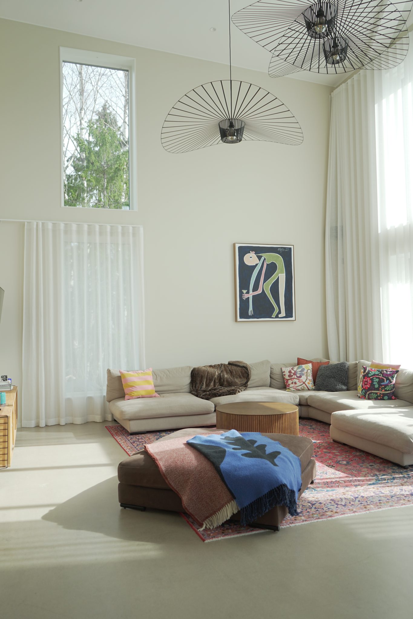 Neste projeto, o desafio era claro: uma divisão com teto muito alto, betão à vista e móveis baixos. O som ecoava e o espaço parecia vazio.