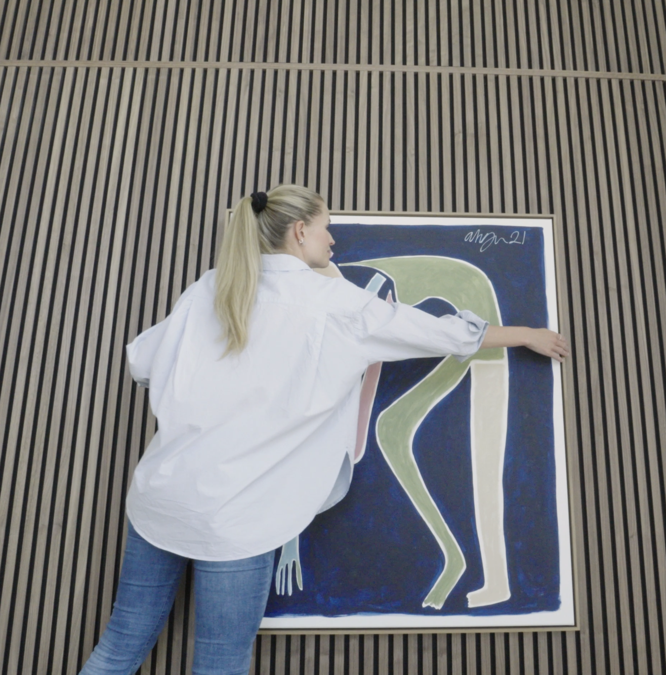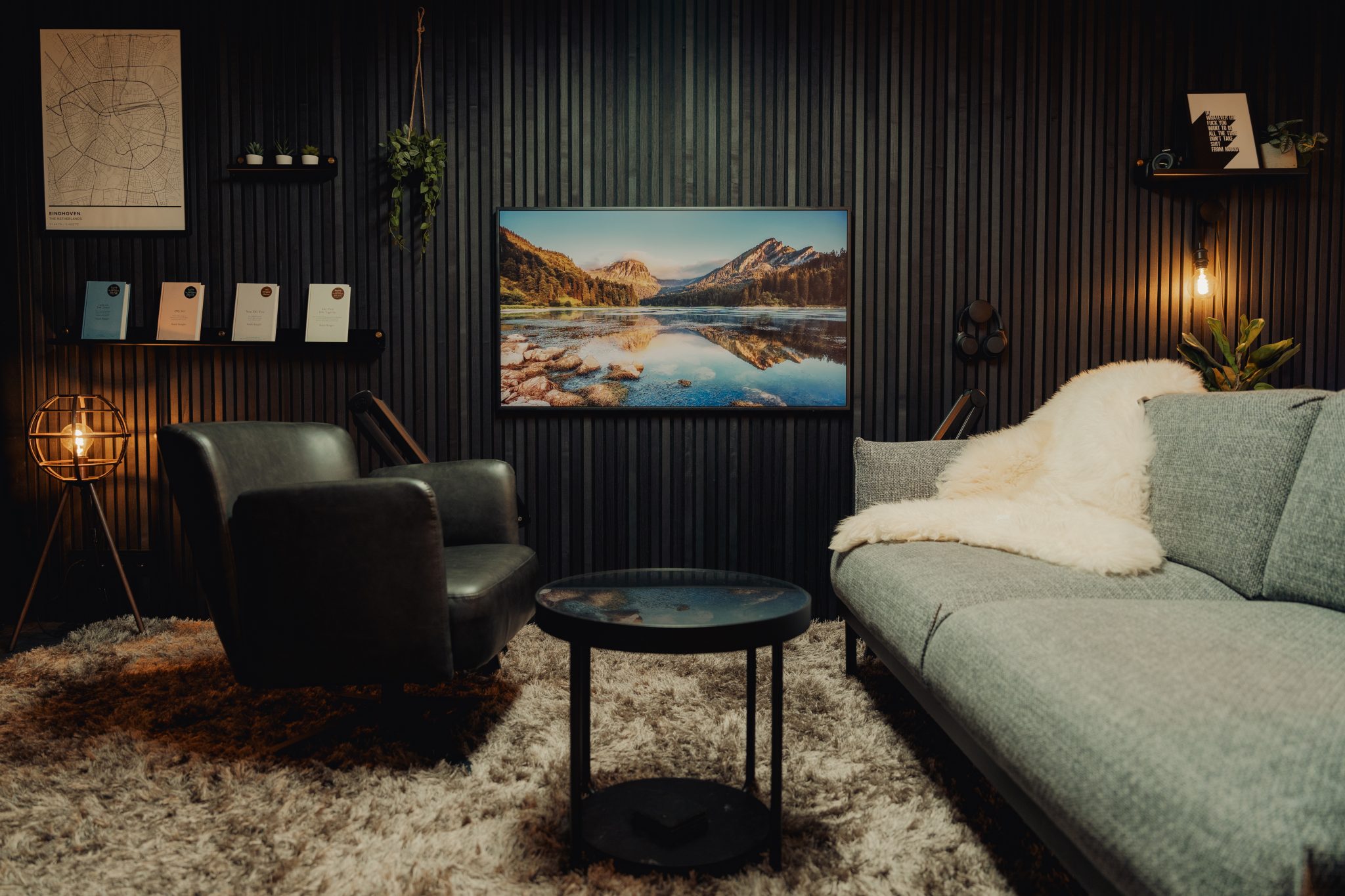 Os Akupanels do chão ao teto voltam a ser a solução — mas aqui são usados de forma estratégica, para enquadrar a parte central da parede e criar um ponto focal.