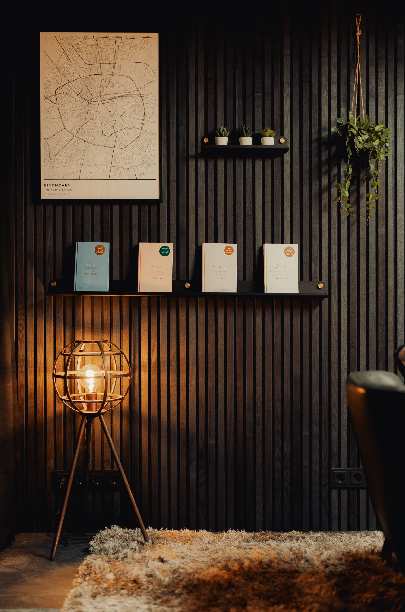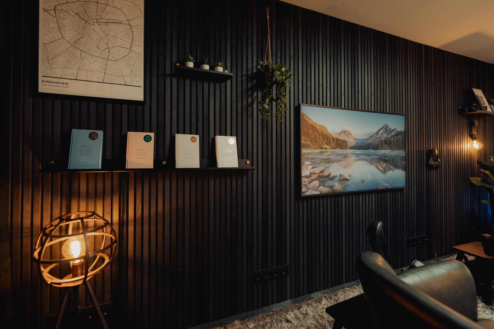 Neste estúdio em casa, que é meio escritório, meio sala social, os painéis escuros da WoodUpp fazem magia.