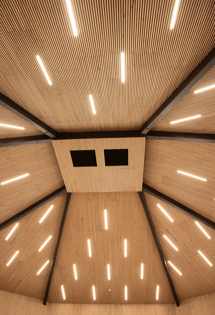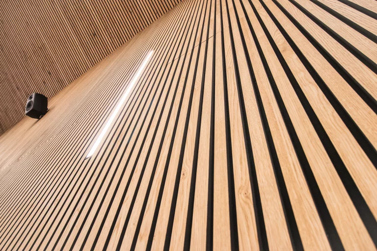 Os painéis foram instalados com bom gosto tanto no teto como nas paredes da espaçosa área aberta, proporcionando excelentes soluções acústicas.