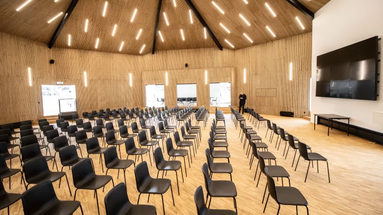 A sala de conferências tem um amplo espaço aberto no centro, com centenas de cadeiras à frente de um enorme ecrã digital, perfeito para apresentações e conferências.