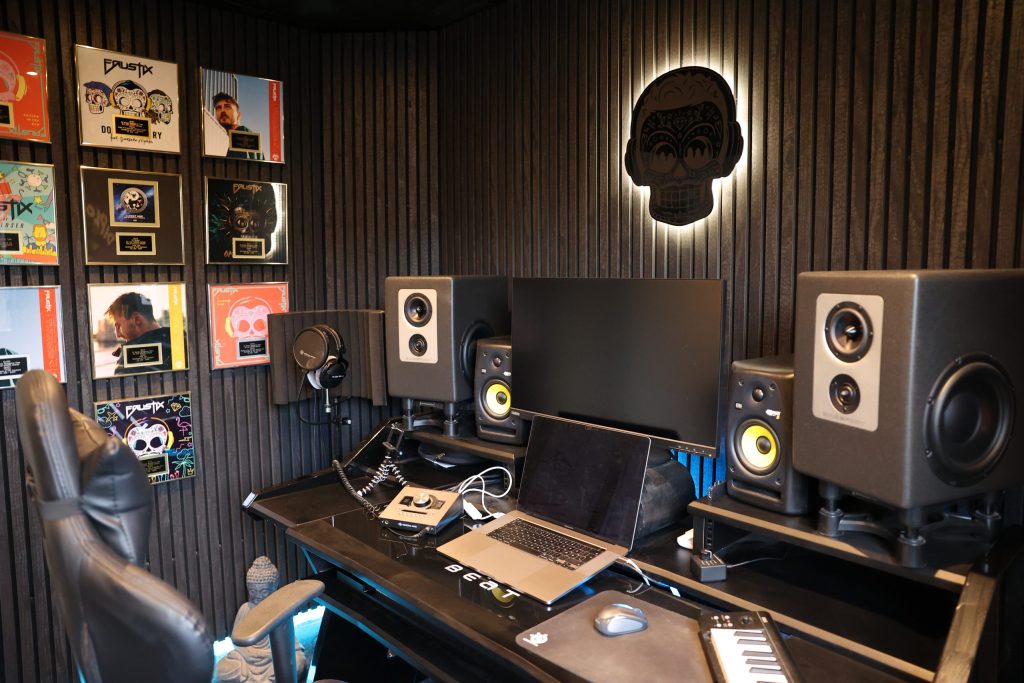 Durante a nossa entrevista com Faustix, no estúdio da sua casa, observámos que a sua sala de estar está a apenas 30 metros de distância, e o seu quarto a 40 metros.