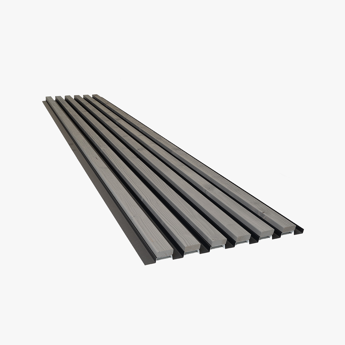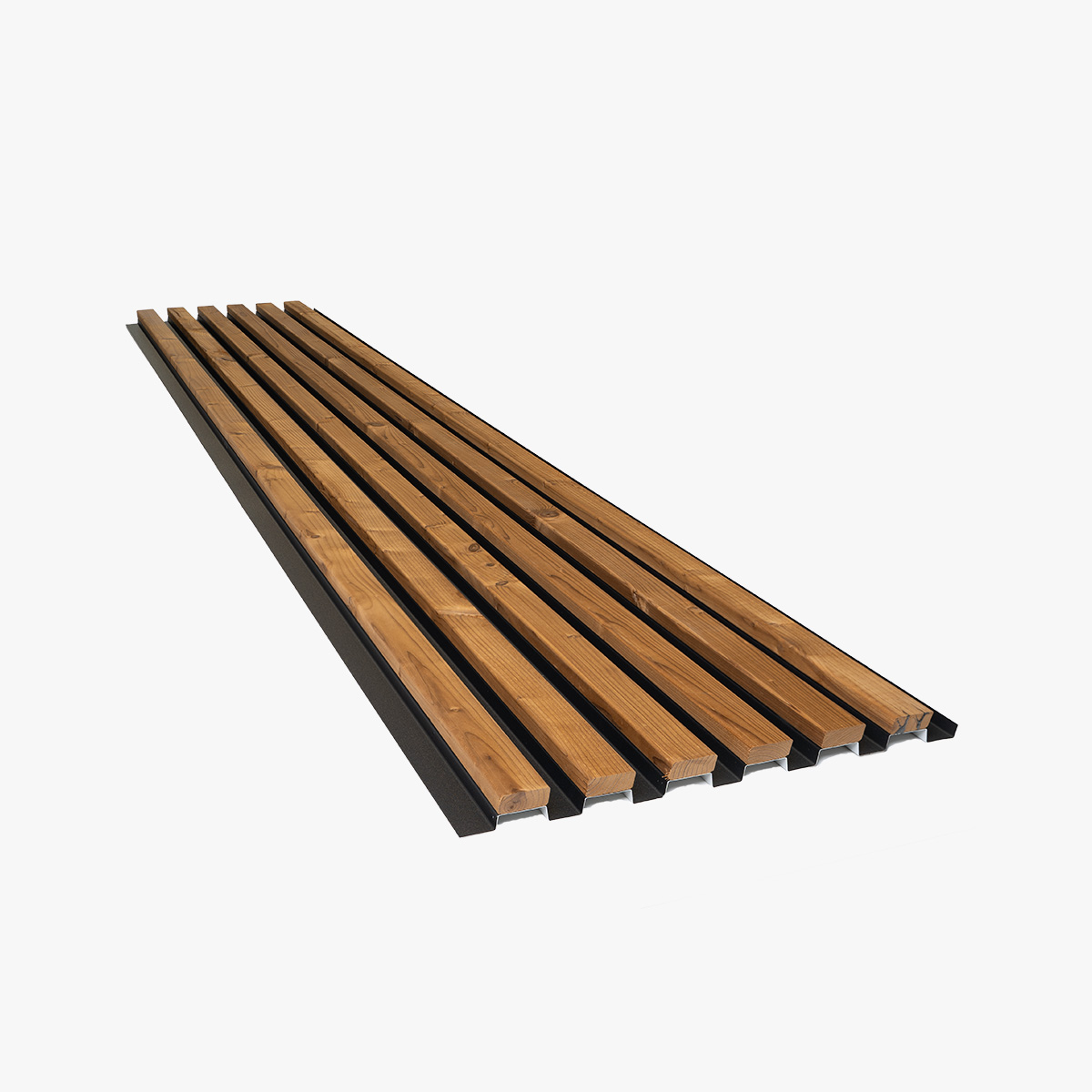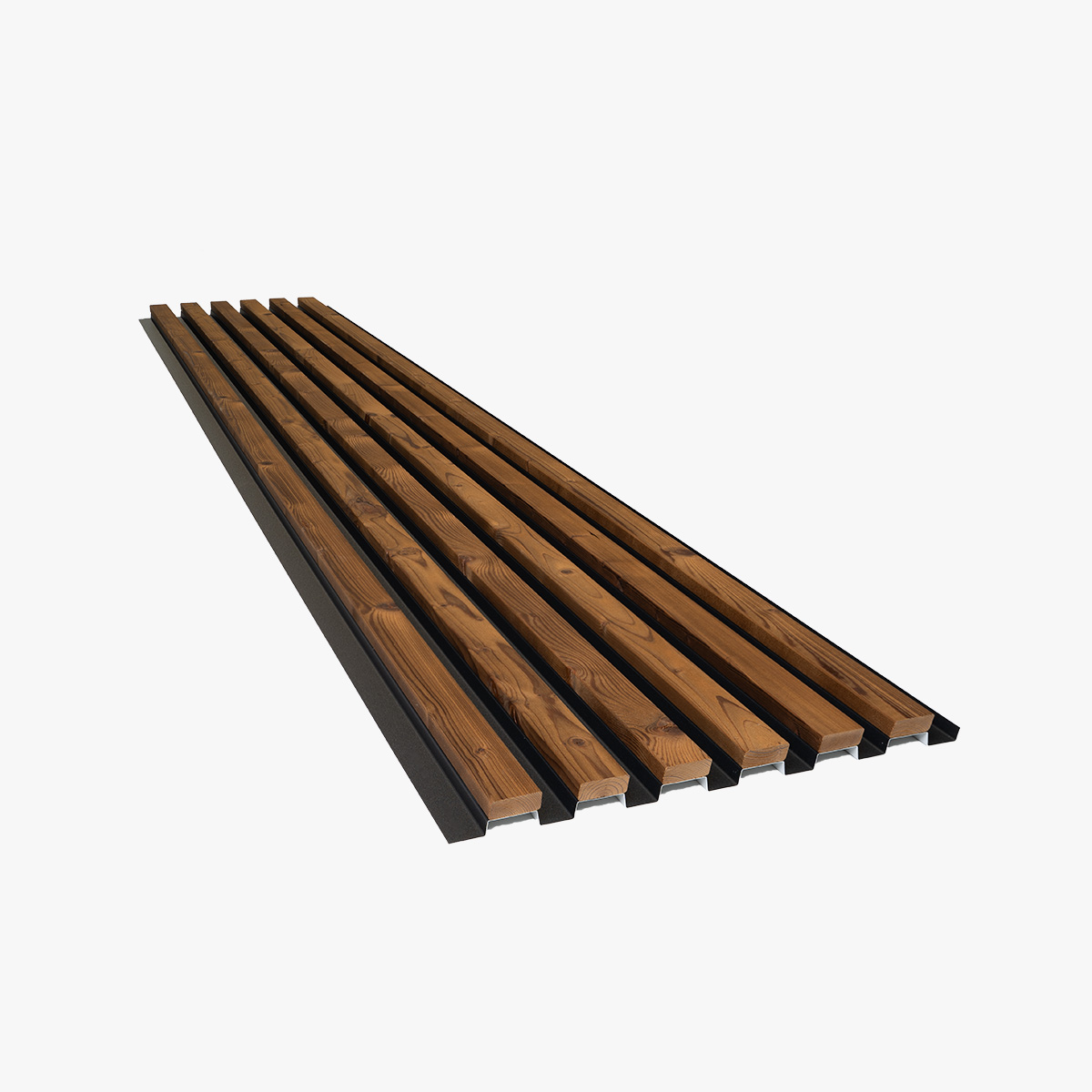 Lamas de abeto tratadas termicamente são coladas a um suporte de alumínio revestido a pó — uma construção desenvolvida e fabricada em Skærbæk, Dinamarca. O resultado é o calor e a textura da madeira real, mantidos no lugar por uma estrutura que não se deforma, torce ou cede.