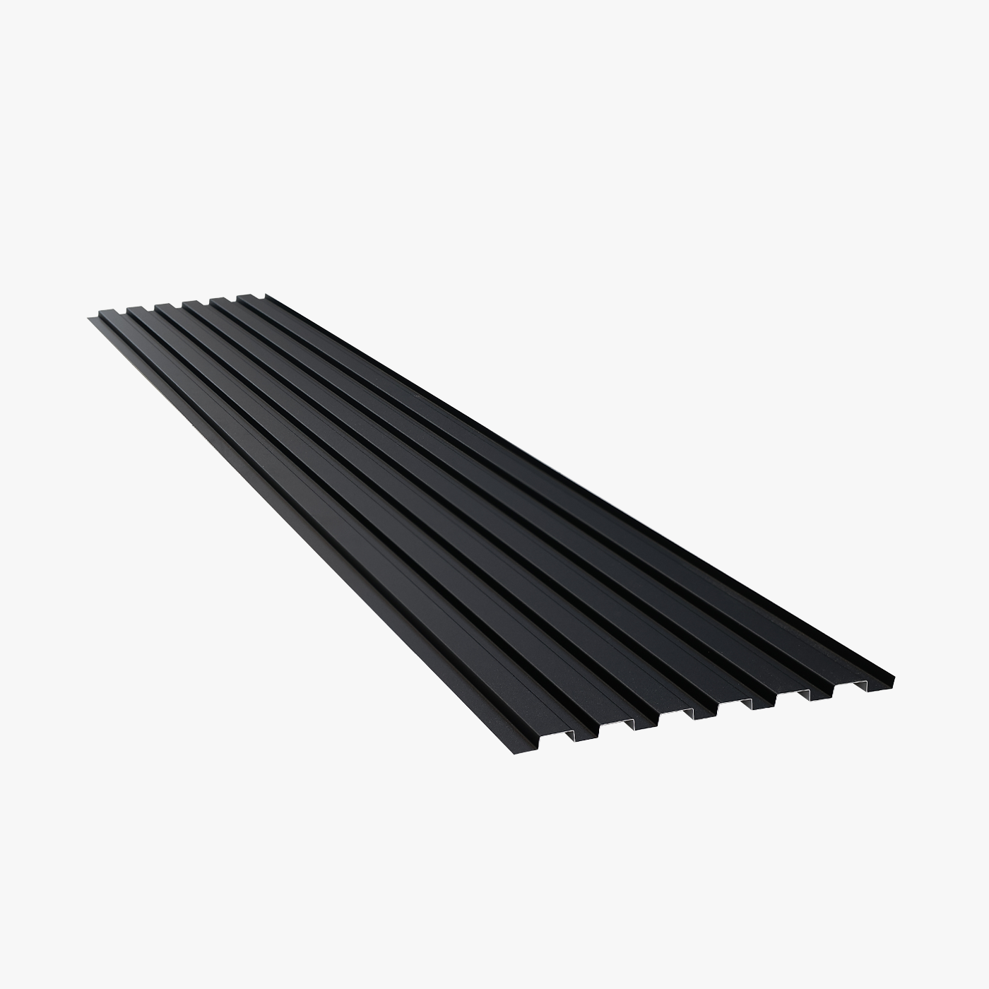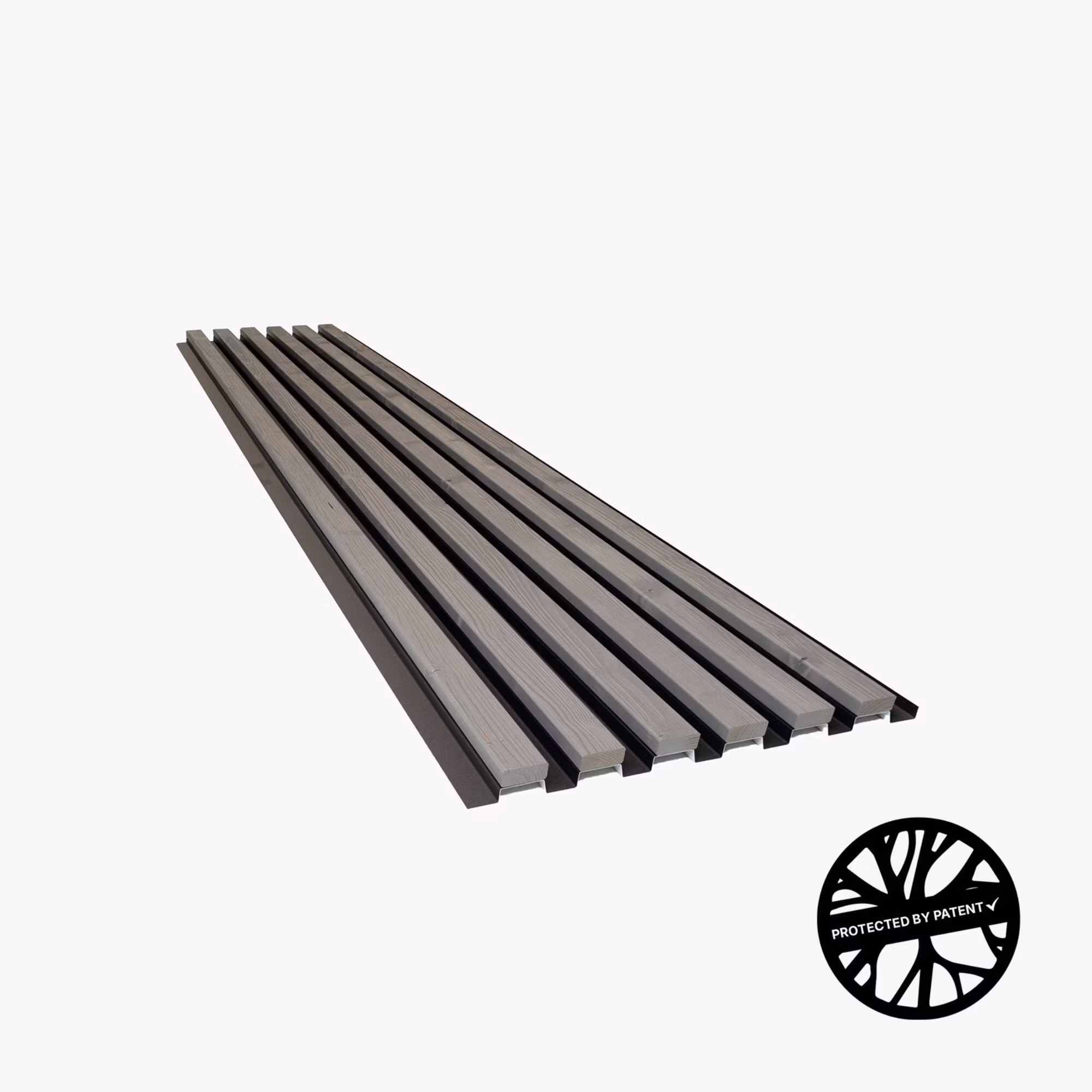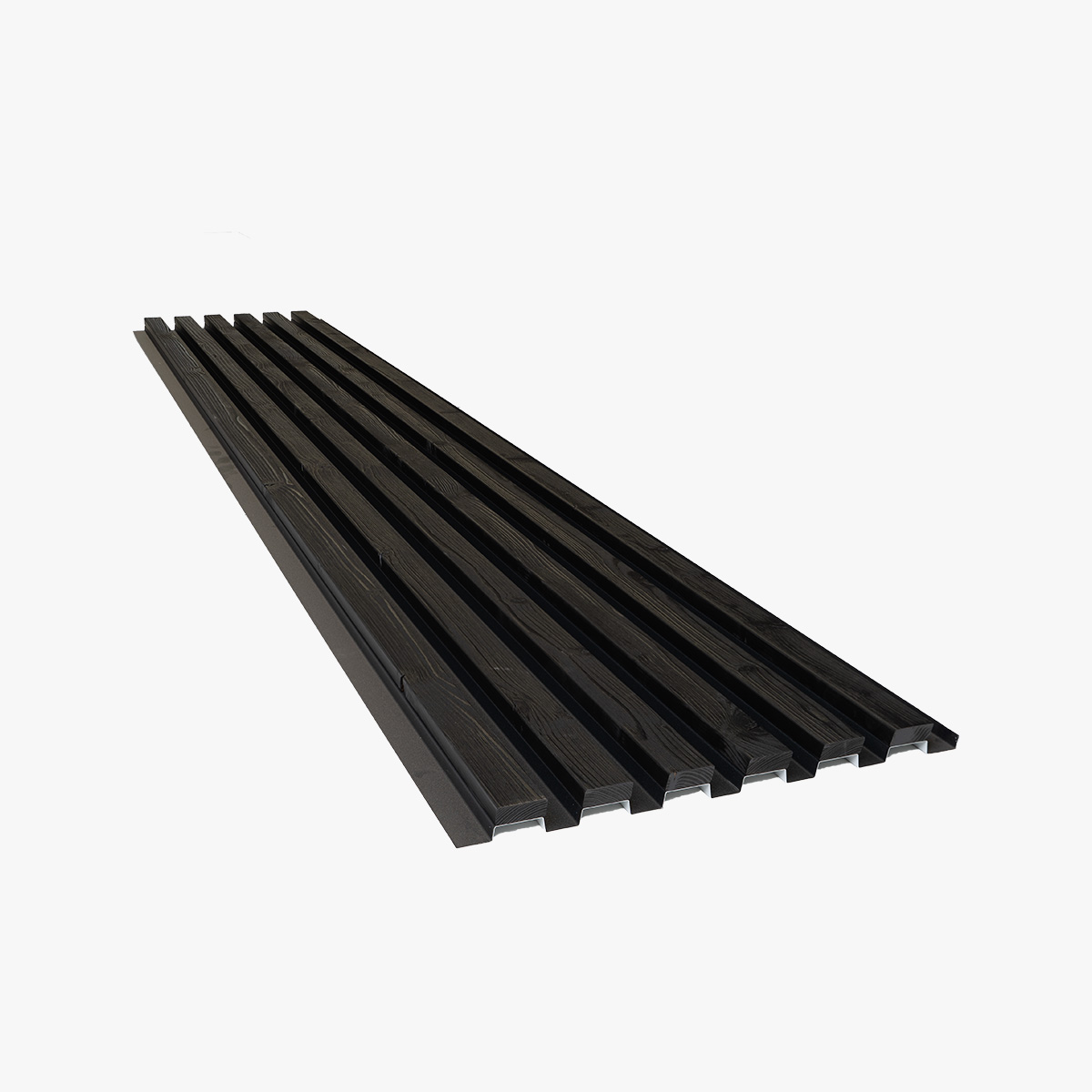 Lamas de abeto tratadas termicamente são coladas a um suporte de alumínio revestido a pó — uma construção desenvolvida e fabricada em Skærbæk, Dinamarca. O resultado é o calor e a textura da madeira real, mantidos no lugar por uma estrutura que não se deforma, torce ou cede.