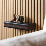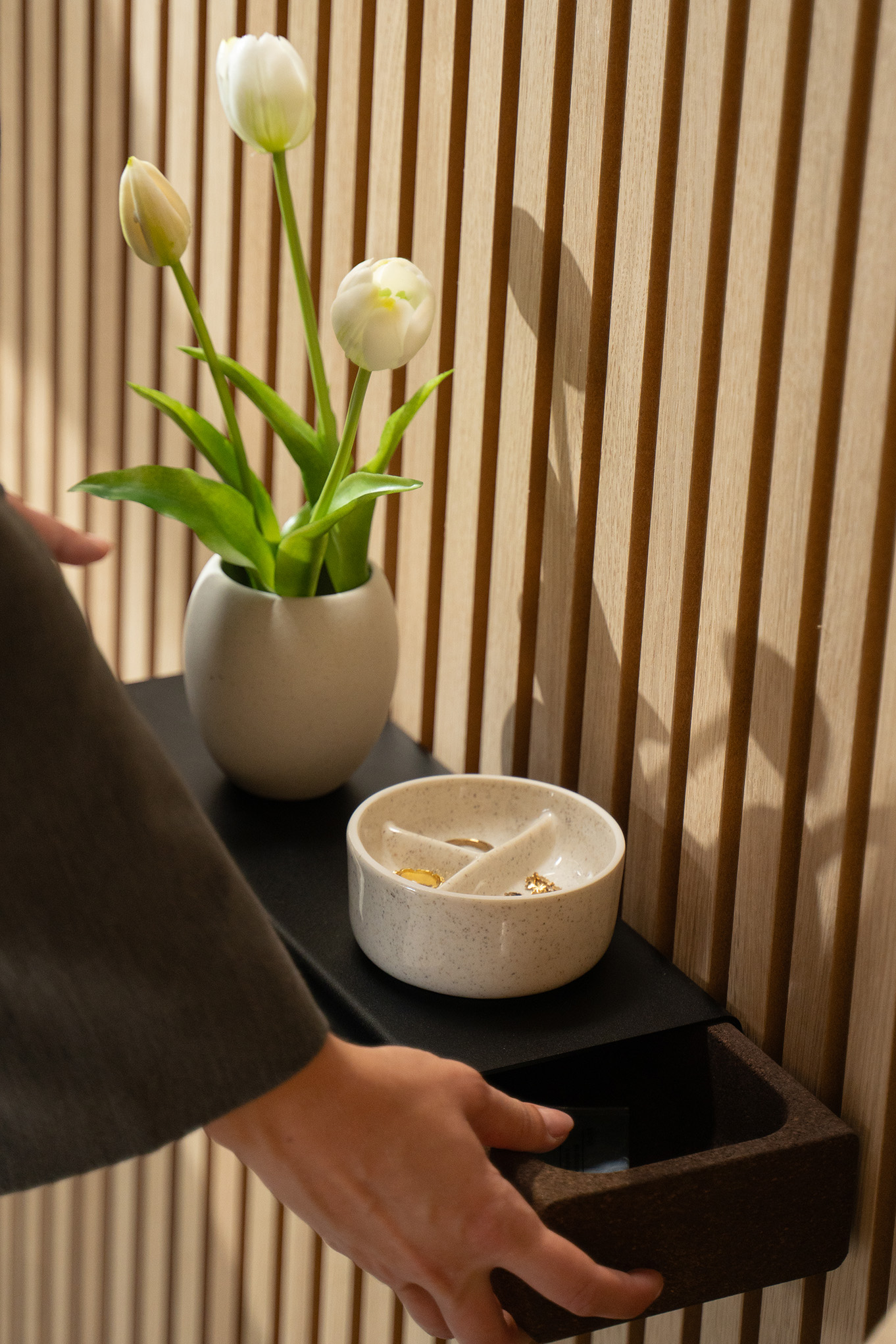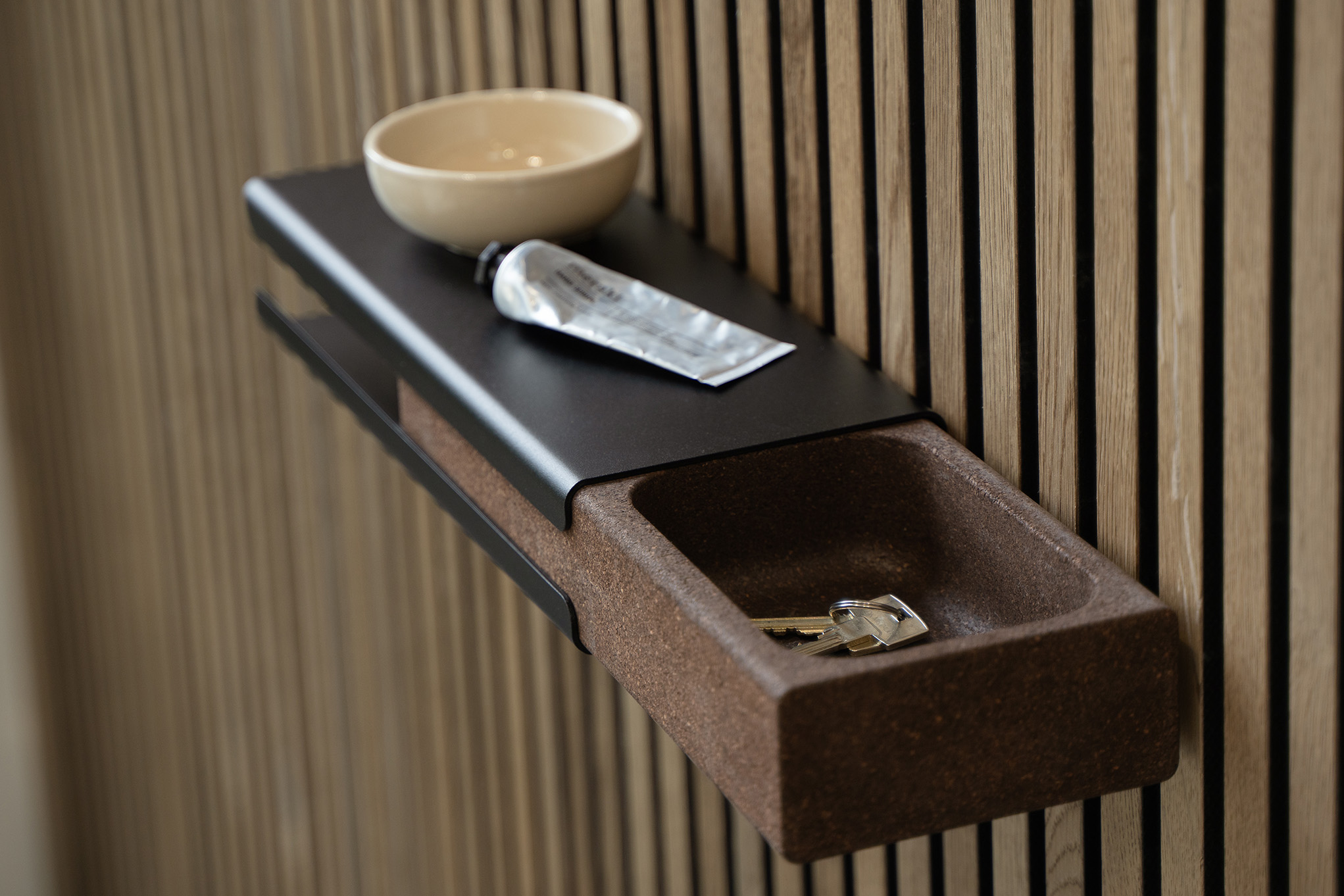 A bandeja para chaves é feita de aço preto com acabamento termolacado e inclui uma gaveta oculta em cortiça fumada. Monta-se facilmente nos Akupanel com os suportes incluídos e mantém pequenos essenciais como chaves, óculos e carregadores fora da vista – sem ocupar espaço extra.