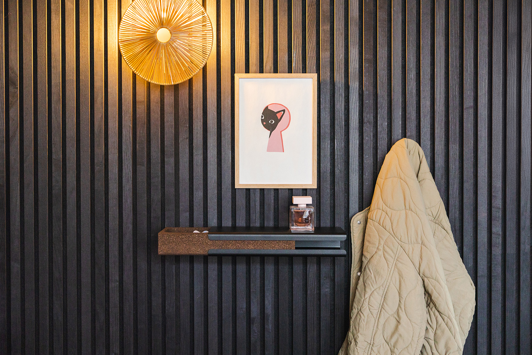 A bandeja para chaves é uma prateleira elegante com um segredo: uma gaveta deslizante em cortiça que esconde os objetos do dia a dia e dá ao espaço uma sensação de ordem e tranquilidade.
